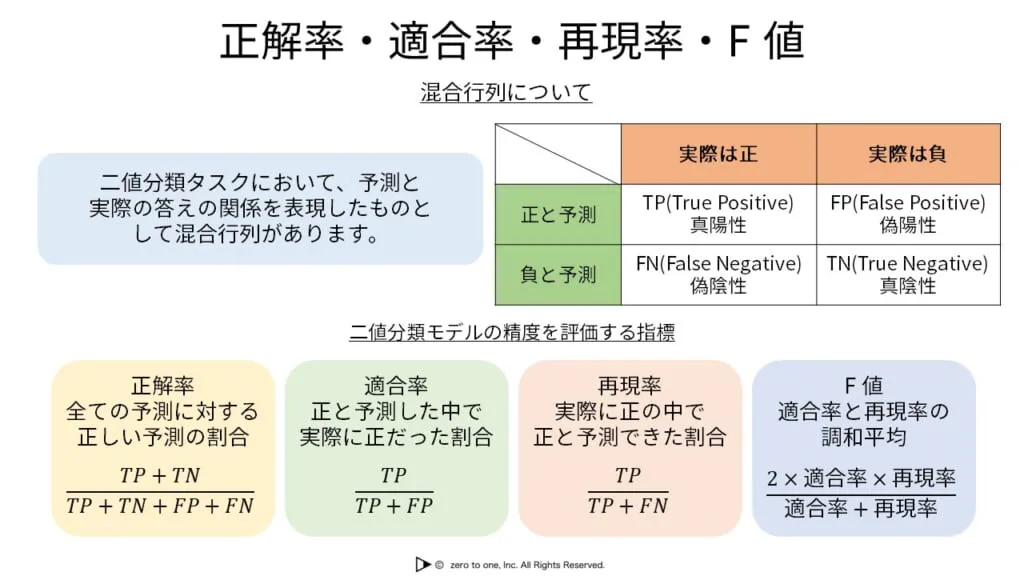 二値分類の予測において、モデルの全予測に対する正しい予測の割合を正解率(Accuracy)、モデルが正と予測した中で実際に正だった割合を適合率(Precision)、実際に正だった中でモデルが正と予測できた割合を再現率(Recall)、適合率と再現率の調和平均を取った値をF 値(F-measure)といいます。