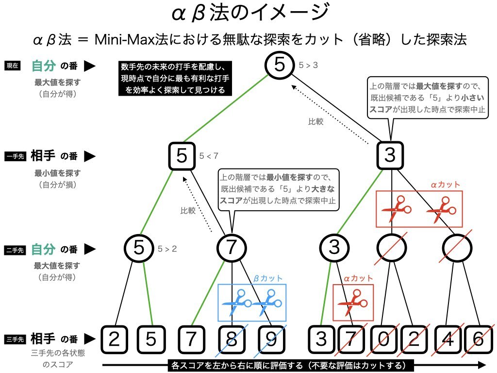 Mini-Max法による探索をできるだけ減らす手法をαβ法と呼びます。