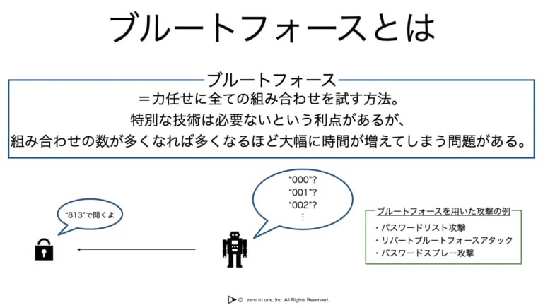 この手法は特別な技術は特に必要ありませんが、組み合わせの数が多くなればなるほど大幅に時間が増加してしまうという問題点があります。ブルートフォースを用いた攻撃はブルートフォースアタックとよばれ、パスワードリスト攻撃、リバートブルートフォースアタック、パスワードスプレー攻撃などが存在します。
