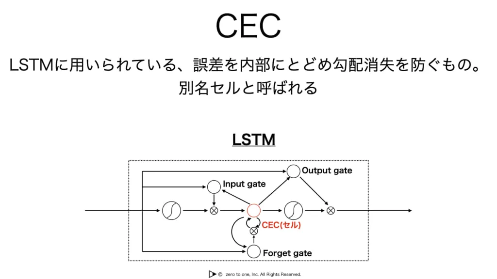 このCECは誤差を内部にとどめる役割を持っており、勾配消失を防ぎます。