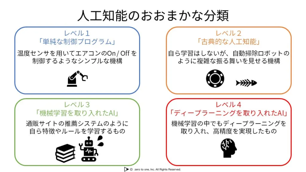 まず、レベル1は「単純な制御プログラム」です。これはエアコンのような、センサーで温度を測定し、自動でOn/Offを切り替えるようなものを指します。レベル2は「古典的な人工知能」であり、自動で掃除するロボットのように多彩な振る舞いを見せるものを指します。自ら学習することはしないのが特徴です。レベル3は「機械学習を取り入れたAI」であり、学習データから自らその特徴やルールを学習することが可能です。レベル4は「ディープラーニングを取り入れたAI」です。ディープラーニングは機械学習の手法の一つであるニューラルネットワークを更に発展させたものであり、レベル3よりも更に高度な精度を実現します。