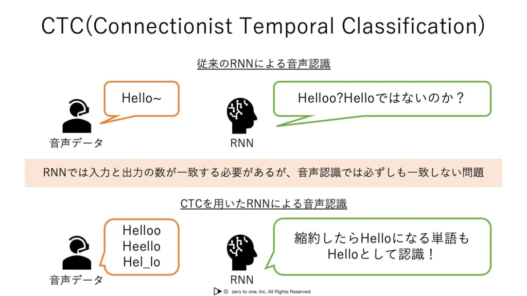 RNNでは入力したデータの数と得られる出力の数は一致しますが、音声入力を扱う際、必ずしも入力した音声データの数と出力すべき音素の数は一致する訳ではないため、このギャップを解消する手法がCTC(Connectionist Temporal Classification)です。