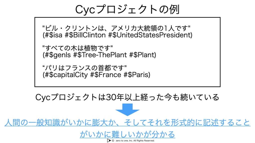 全ての一般常識をコンピュータに取り込もうというCyc(サイク)プロジェクトは1984年からスタートしました。