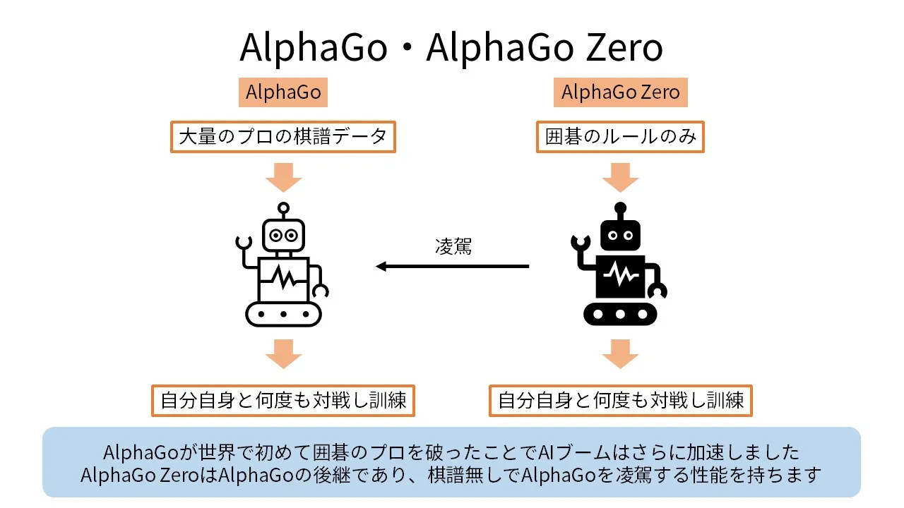 AlphaGoは当時の世界チャンピオン級の棋士を打ち破っていますが、学習に囲碁の譜面を利用しています.その発展形であるAlphaGo Zeroは譜面を利用せず自己対局のみで学習し、さらに高い性能を発揮しました. (参考:G検定公式テキスト 第2版 第6章 6-5 P257) (参考:G検定公式テキスト 第1版 P175-176) (参考: G検定公式テキスト 第3版,p.100,132,145,168,172,286)
