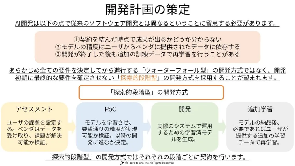 まず、AI開発は契約を結んだ時点で成果が出るかどうか分かりません。また、モデルの精度はユーザからベンダに提供されたデータに依存します。さらに、開発が終了した後も追加の訓練データで再学習を行うというような状況が発生します。そこで、開発方式はあらかじめ全ての機能や要件を決定してから進行する「ウォーターフォール型」ではなく、開発初期に最終的な要件を確定させない「探索的段階型」を採用することが望まれます。