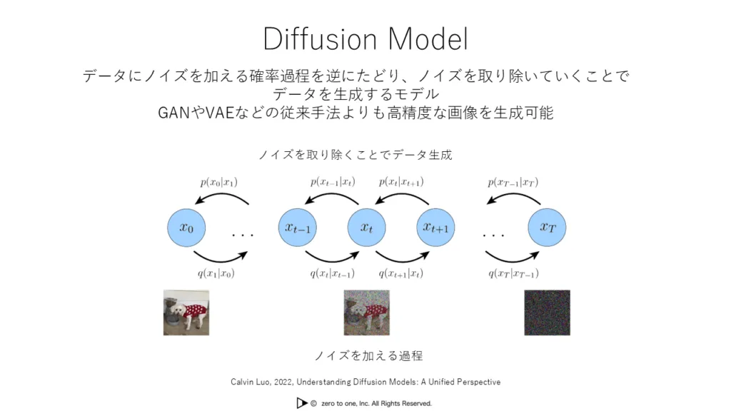 Diffusion Model(拡散モデル)は生成モデルの一種です。データにノイズを徐々に加えていくという過程を逆に辿り、ノイズを取り除くことで元のデータを生成するという手法を取ります。