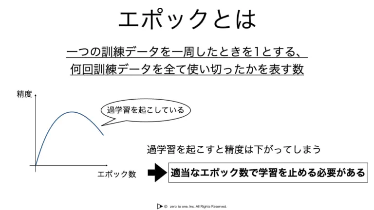エポック数が多すぎると過学習が生じてしまう可能性があるので適当なエポック数で学習を止める必要があります。