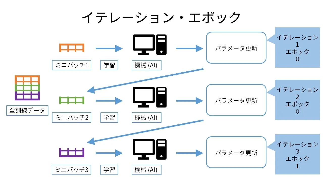 イテレーションとは繰り返しや反復を意味し、機械学習では重みが更新された回数を表します。エポックは訓練データ全体を学習した回数です。