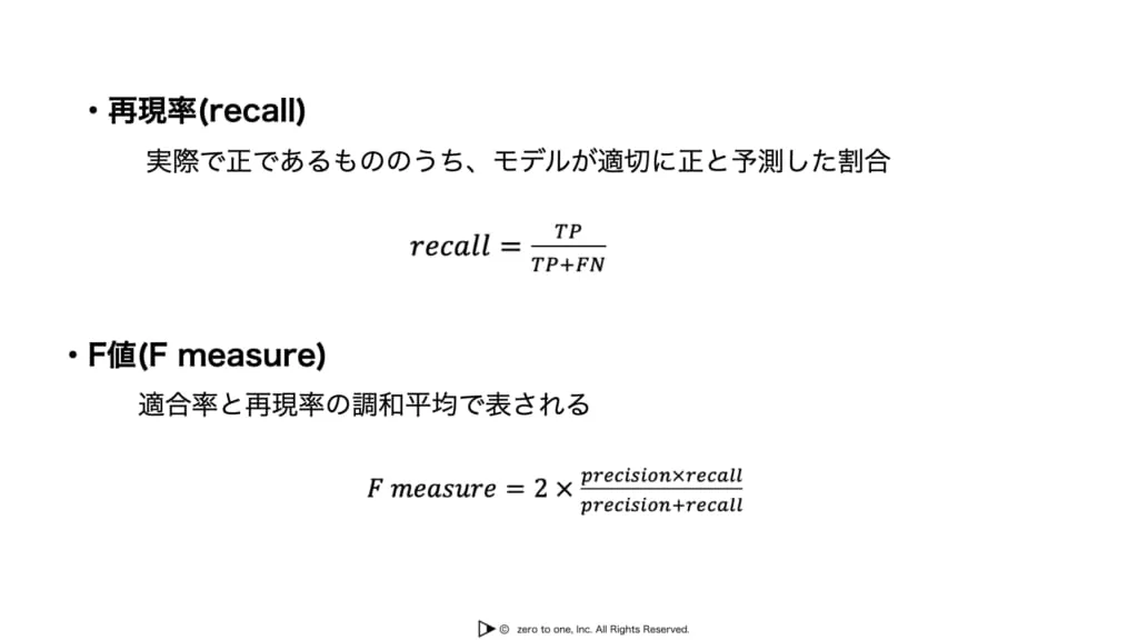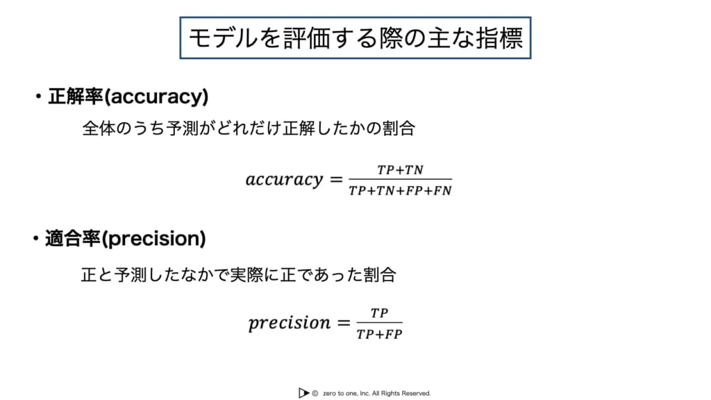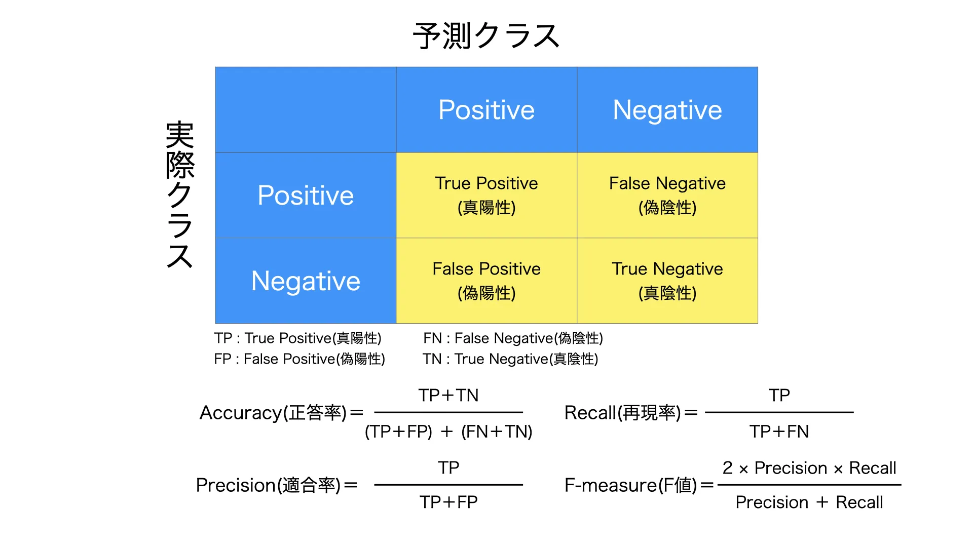 予測値と実際の値の関係によって真陽性(True Positive),偽陽性(False Positive),偽陰性(False Negative),真陰性(True Negative)に分けられます。これらの値を用いた指標として正解率,適合率,再現率,F値などがあり、これらを目的に沿って選択し、適切にモデルを評価する必要があります。