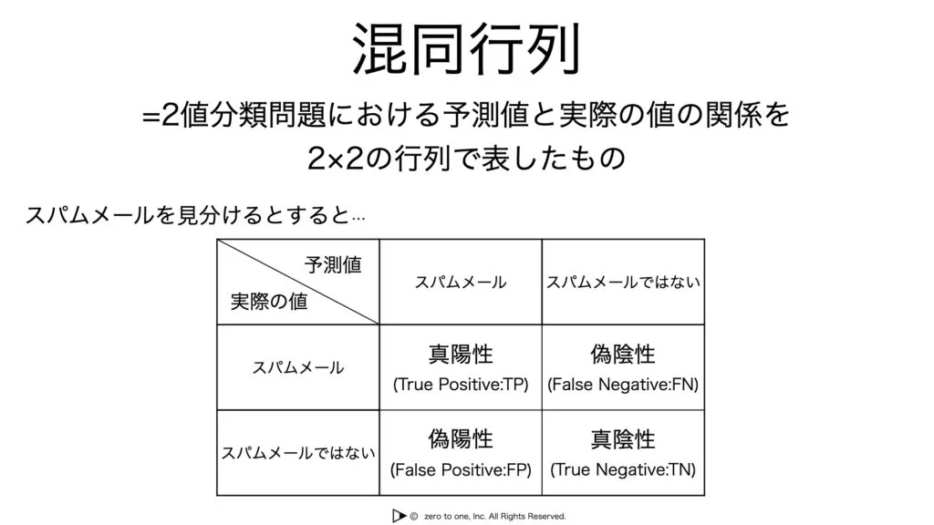 混同行列は2値分類問題において、予測値と実際の値の関係を示す2×2で表現された行列です。