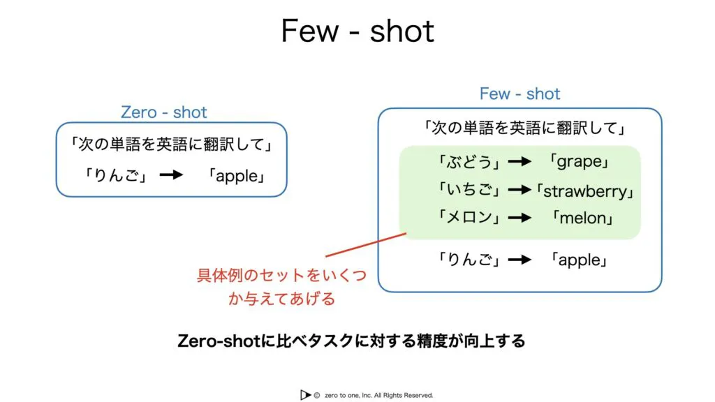 Few-shot とは、Zero-shot が指示文のみでタスクを解決したのに対して、具体例をいくつか入力することでタスクで求める答えの精度を向上させる手法です。
