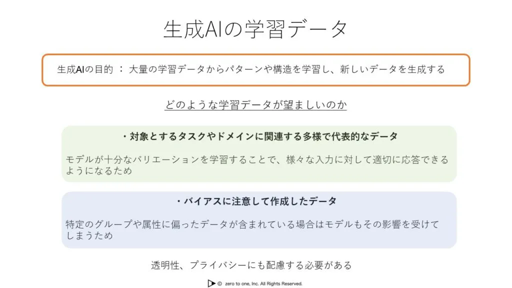 学習データは、生成AIが対象とするタスクやドメインに関連する多様で代表的なデータである必要があります。モデルが十分なバリエーションを学習することで、様々な入力に対して適切に応答できるようになるからです。