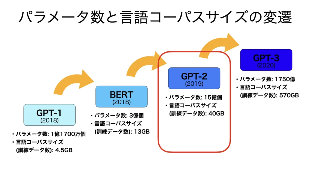 GPT-2は、GPT-1に続いて2019年2月にOpenAIから発表された、文章生成を行う言語モデルである。従来のGPT-1と比較し、以下の点が特徴である。