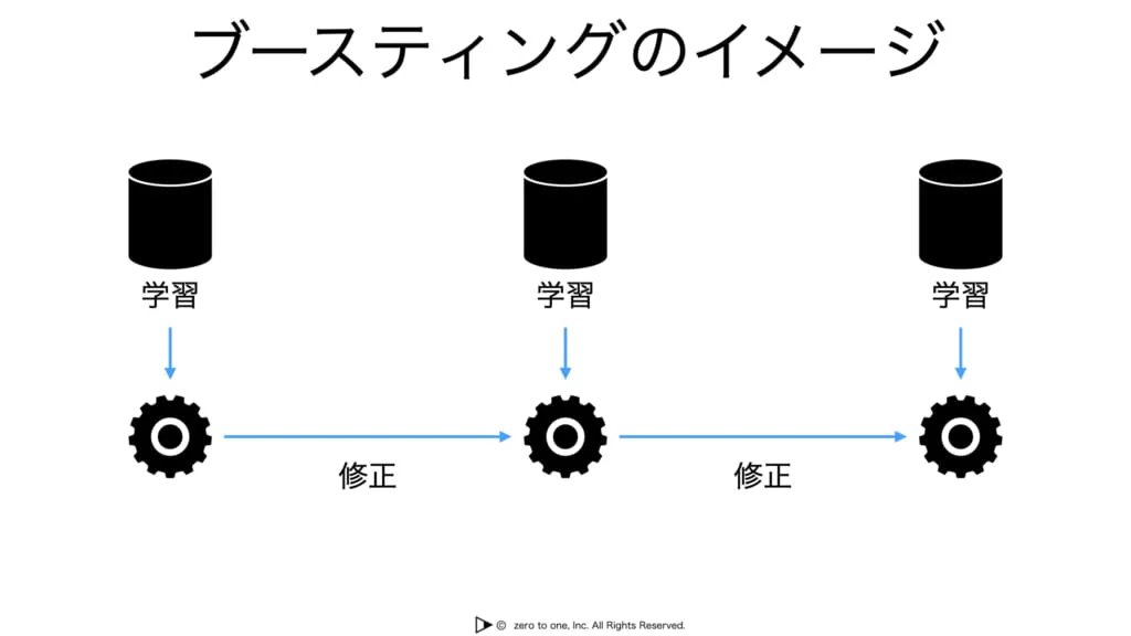 ブースティングとは弱学習器(性能があまりよくない学習器)を順番に学習していき、前の学習器が誤分類したデータを優先的に正しく分類できるように重みを加味していく手法です。