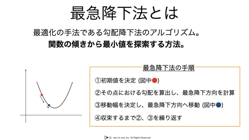 最急降下法とは最適化の手法である勾配降下法に用いられるアルゴリズムです。