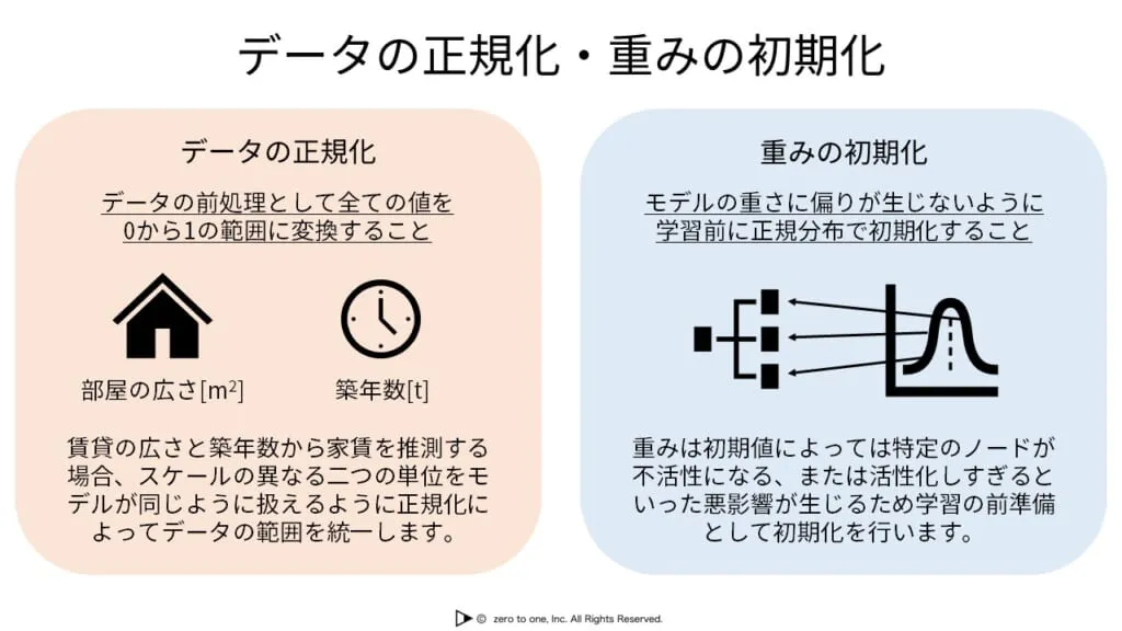 例えば、賃貸の広さと築年数から家賃を推測する場合、「平方メートル」と「年数」といったスケールの異なる二つの単位が存在していることになります。これはモデルの学習精度を悪化させるため、正規化によってその範囲を統一します。また、重みは初期値によっては特定のノードが不活性になる、または活性化しすぎるといった悪影響が生じるため学習の前準備として初期化を行います。