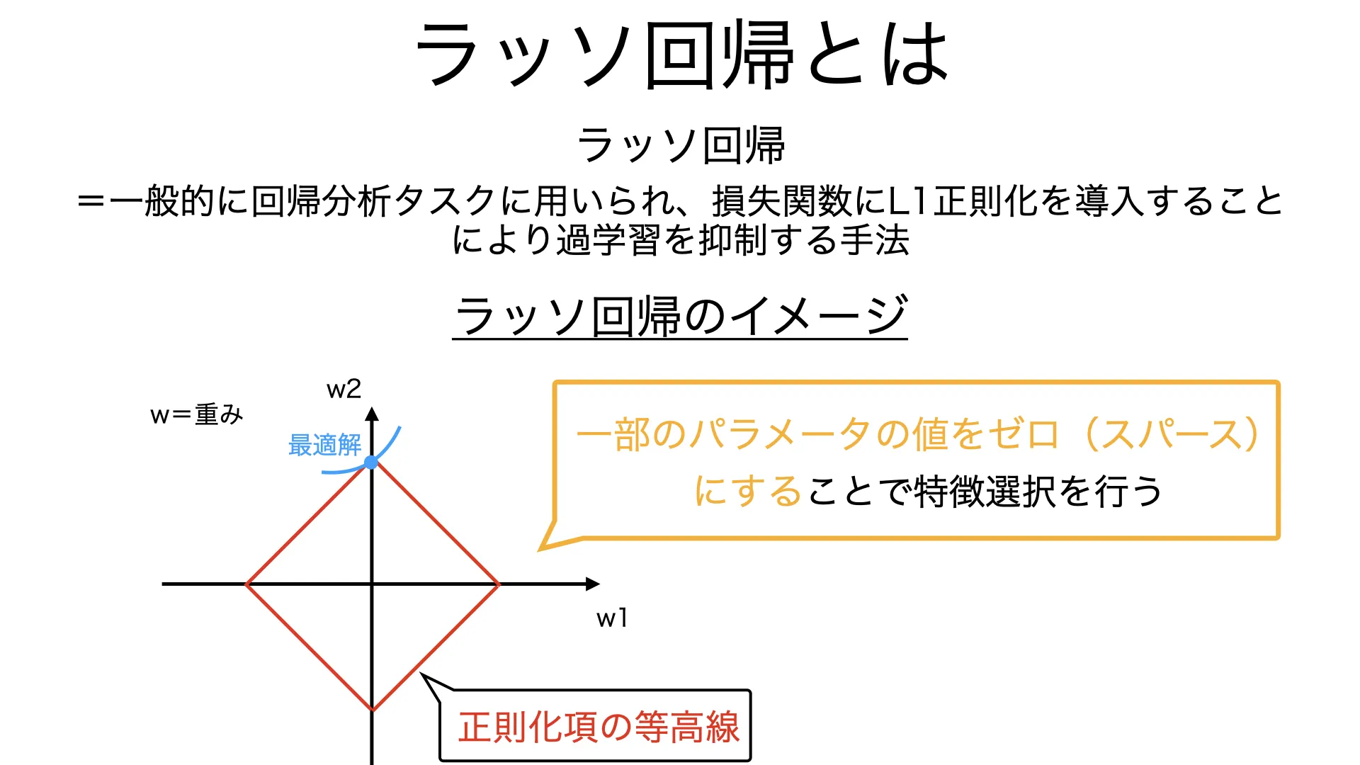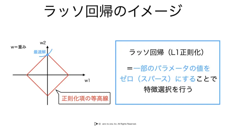 ラッソ回帰は、線形回帰に対して L1正則化を適用した手法であり、一部のパラメータの値をゼロ(スパース)にすることで特徴選択を行うことが出来ます。