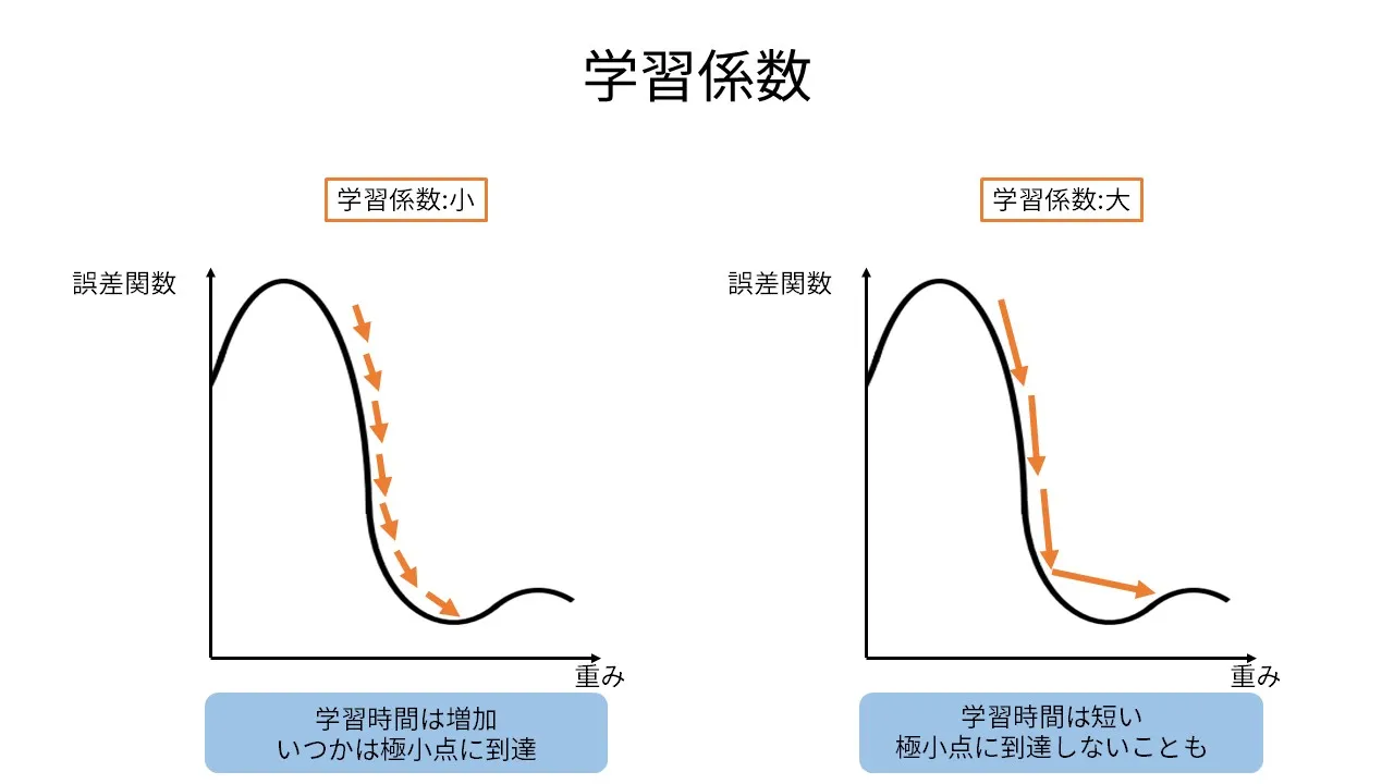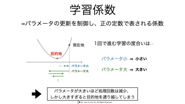 学習係数とはパラメータの更新を制御する役割をもち、正の定数で表される係数です。