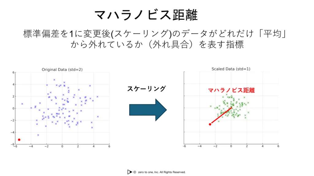 マハラノビス距離とは、データがどれだけ「平均」から外れているか(外れ具合)を表す指標です。特徴量ごとのスケールの違いに影響されないよう、あらかじめ標準偏差でスケーリング(標準偏差が1となる)した上で、平均からの距離を測定します。