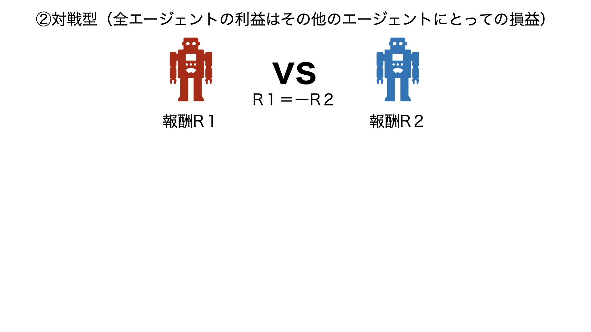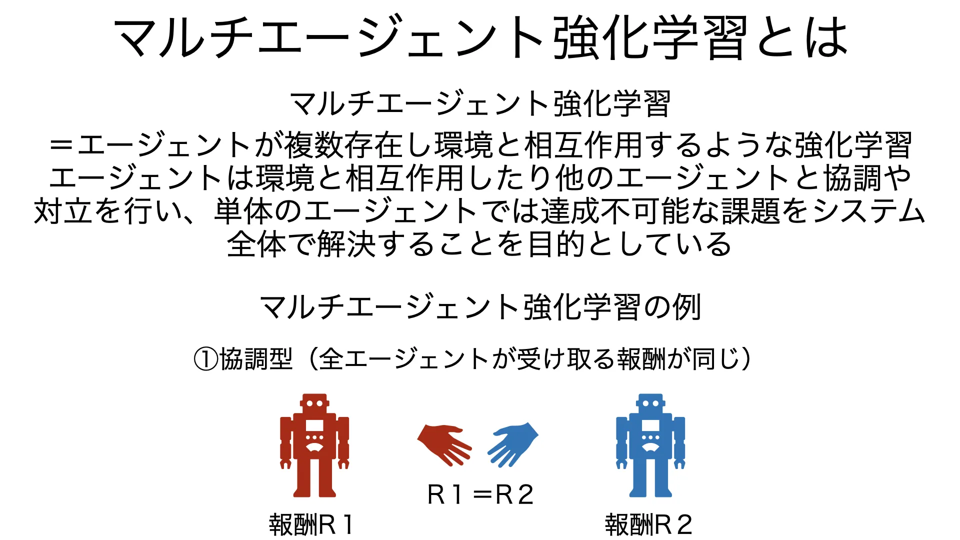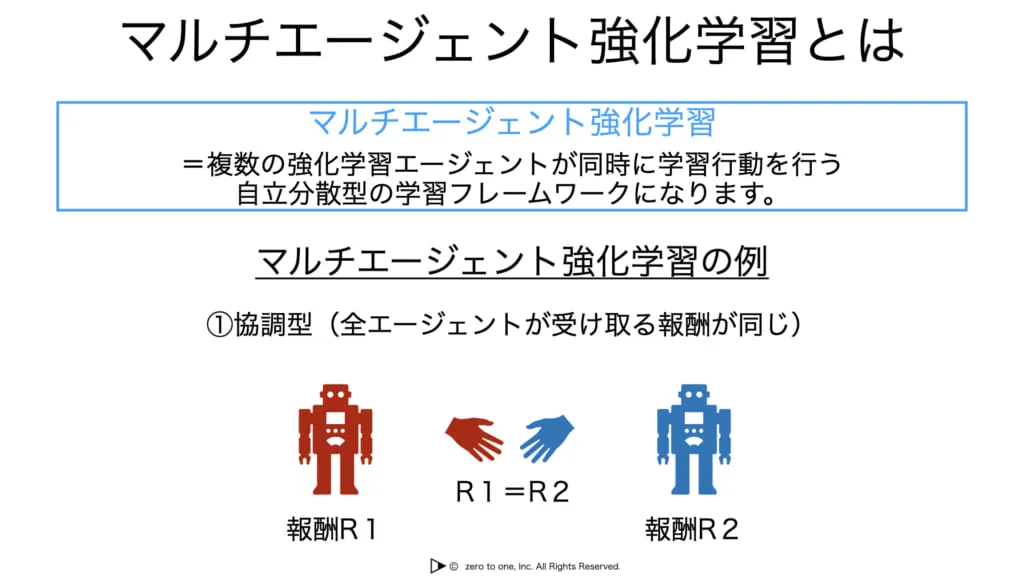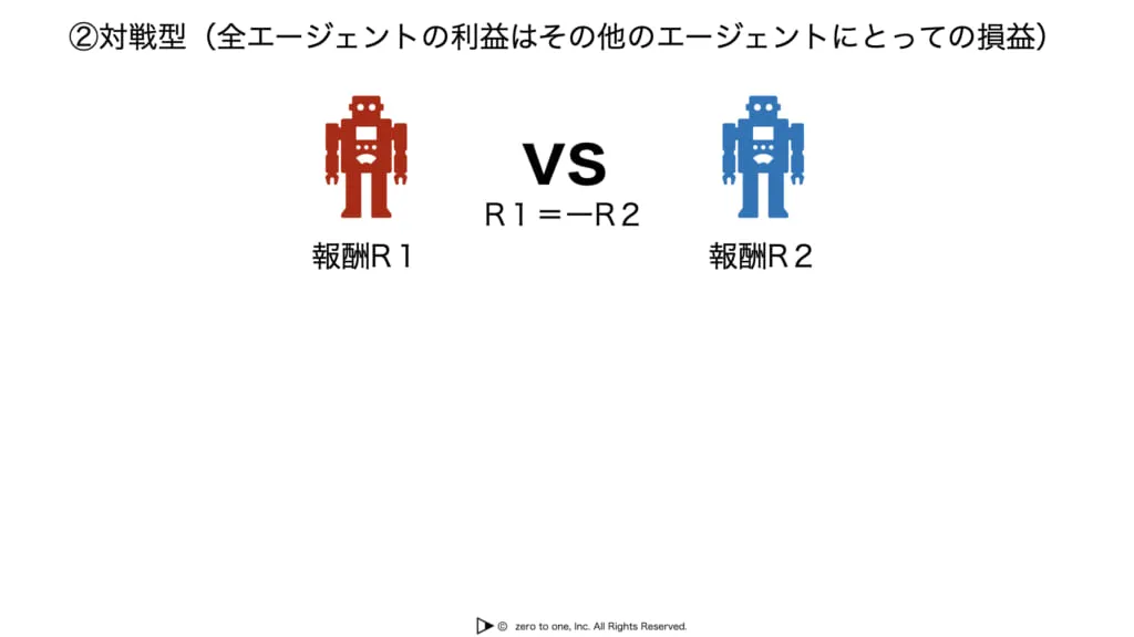 マルチエージェント強化学習には、協調型(全エージェントが受け取る報酬が同じ)や対戦型(あるエージェントの利益はその他のエージェントにとっての損益)などの様々な形式が考えられます。