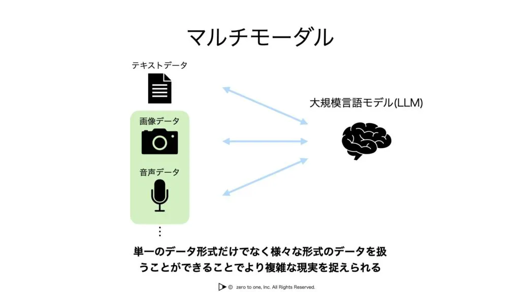 マルチモーダルとは複数の種類のデータを統合して処理するシステムや手法を指します。AIや大規模言語モデルの文脈では、テキスト、画像、音声、ビデオなど異なる種類のデータソースを同時に扱う能力を指しています。
