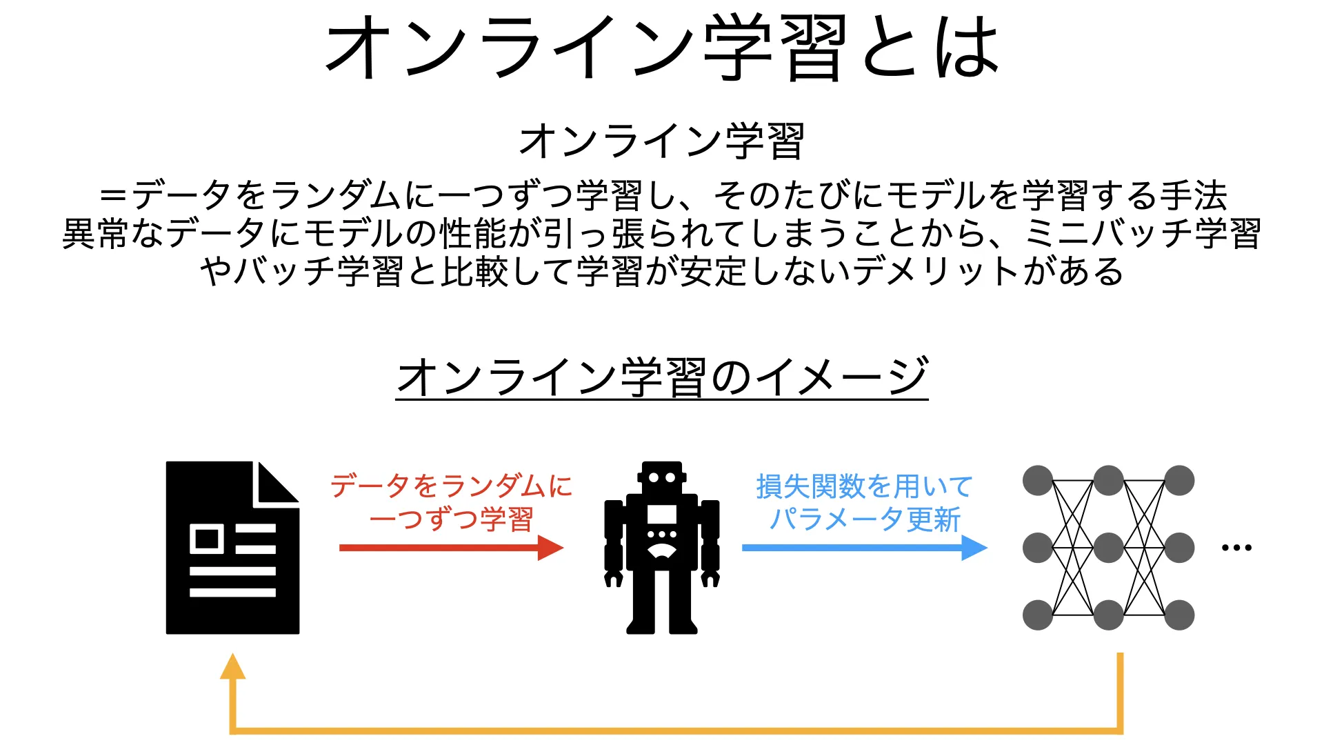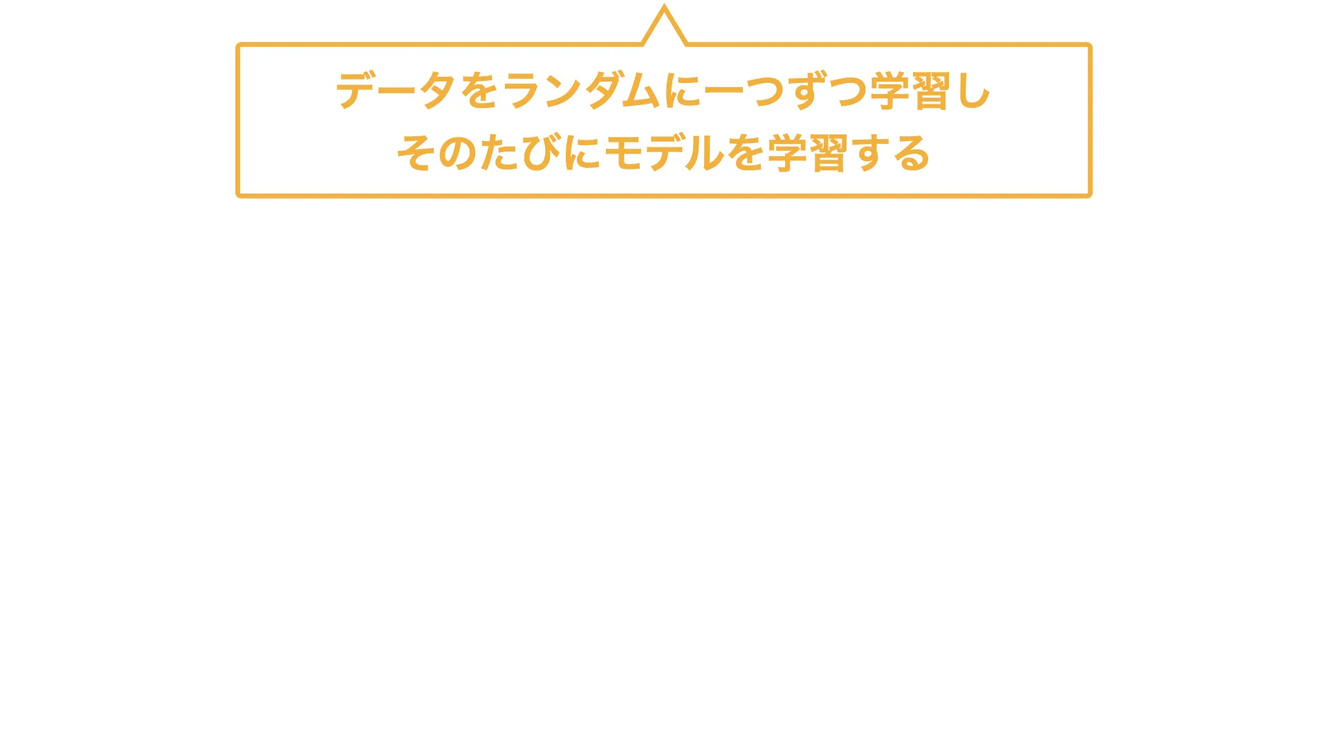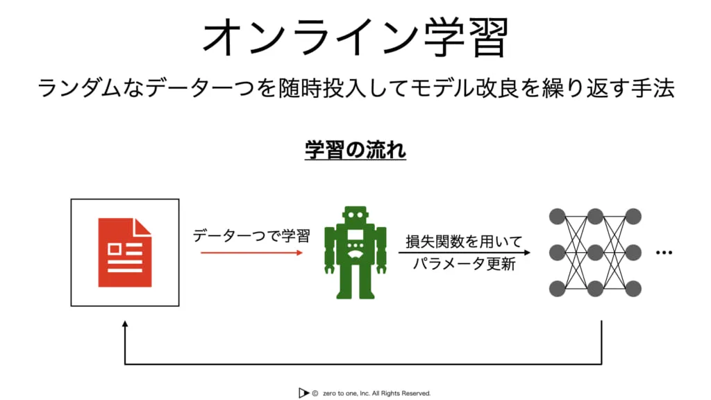 オンライン学習とはランダムなデータ一つを投入してモデル更新を繰り返す手法です。