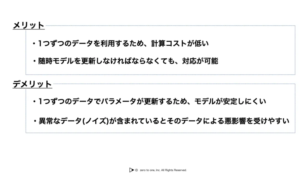 この手法のメリットは一つずつのデータを利用するため、計算コストが低い点、随時モデルを更新しなければならない株価などにも対応が可能である点です。デメリットとしては一つずつのデータにおいてパラメータが更新されるため、モデルが安定しにくいという点、異常なデータが含まれているとそのデータによって悪影響を受けやすいという点が挙げられます。