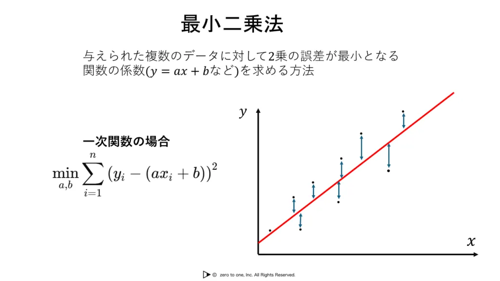 最小二乗法は、観測データとモデルの予測値とのズレ(誤差)の二乗和を最小にする手法です。主に線形回帰や多重回帰のパラメータ決定に用いられ、直線などの関数をデータに最もよく当てはめるために使われます。誤差を二乗することで、大きな誤差により強いペナルティを与えています。