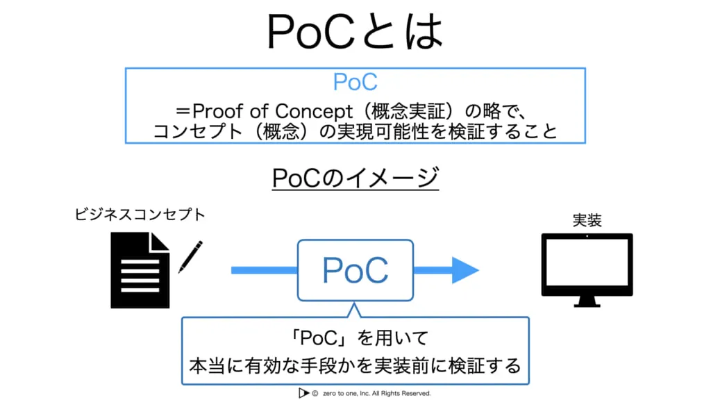PoCとは、Proof of Concept(概念実証)の略で、コンセプト(概念)の実現可能性を検証することです。