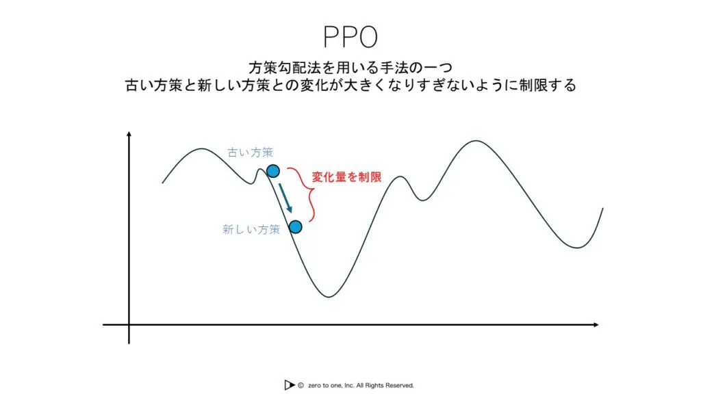 PPO(Proximal Policy Optimization) は強化学習における方策勾配法を用いる手法の一つです。PPOは古いポリシーと新しいポリシーの変化が大きくなりすぎないように制限をしており、大胆すぎる更新によって性能が落ちるのを防いでいます。