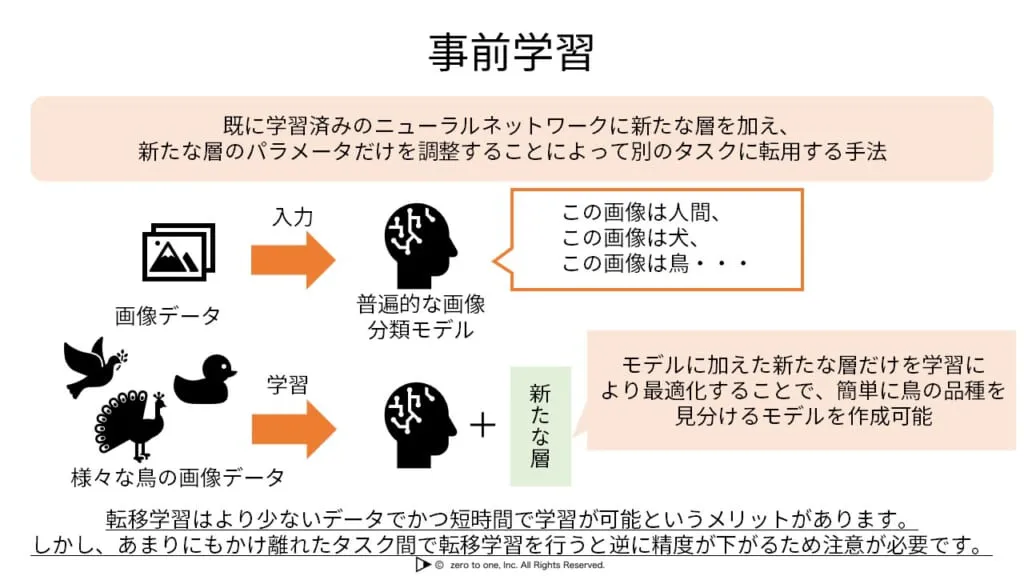 例えば、普遍的な画像分類のモデルを鳥の品種を見分けるモデルとして転移学習を行うといった活用例が考えられます。事前学習はより少ないデータでかつ短時間で学習が可能というメリットがあります。しかし、あまりにもかけ離れたタスク間でこれを行うと逆に精度が下がるため注意が必要です。