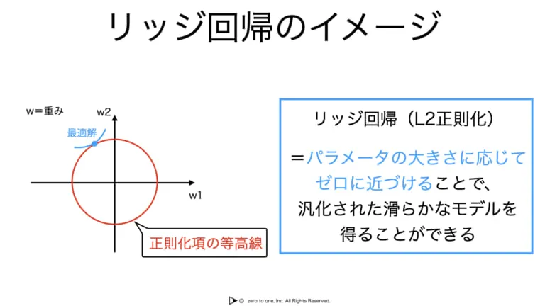 リッジ回帰は、線形回帰に対してL2正則化を適用した手法であり、パラメータの大きさに応じてゼロに近づけることで、汎化された滑らかなモデルを得ることが出来ます。