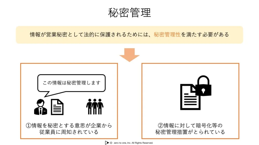企業が持つ情報等を営業秘密として保護を受けるためには、「秘密管理性」を満たす必要があります。