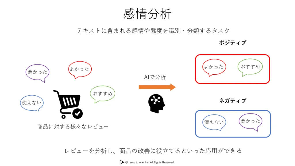 感情分析の主な用途としては、例えば商品レビューやSNS投稿の分析があります。顧客のレビューを分析することで、商品の改善に役立てるといったことに役立てることができます。