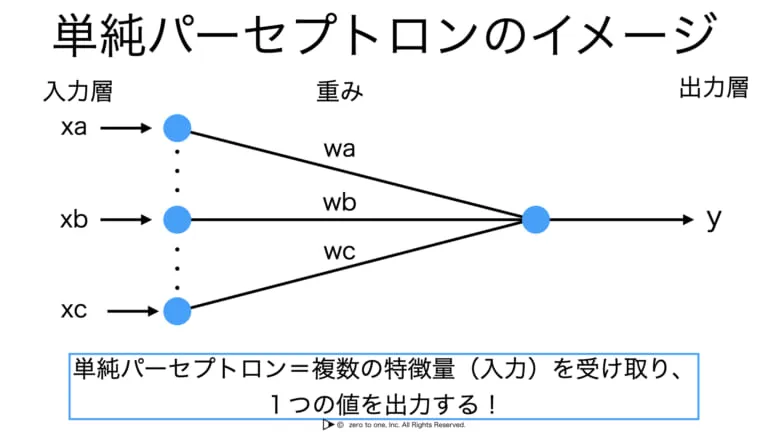 単純パーセプトロンとは、複数の特徴量(入力)を受け取り、1つの値を出力する単純なニューラルネットワークのモデルです。