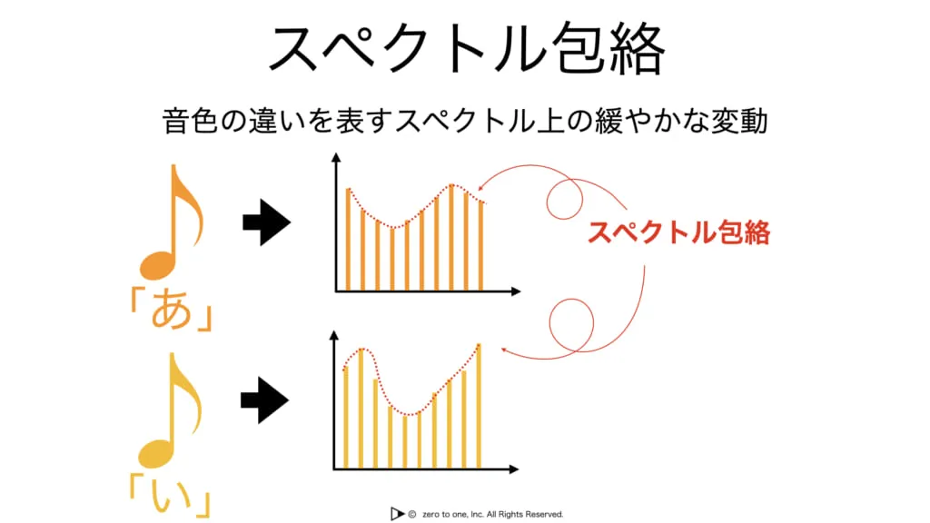 スペクトル包絡は音色の違いを表すスペクトル上の緩やかな変動を表した線です。