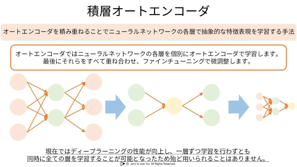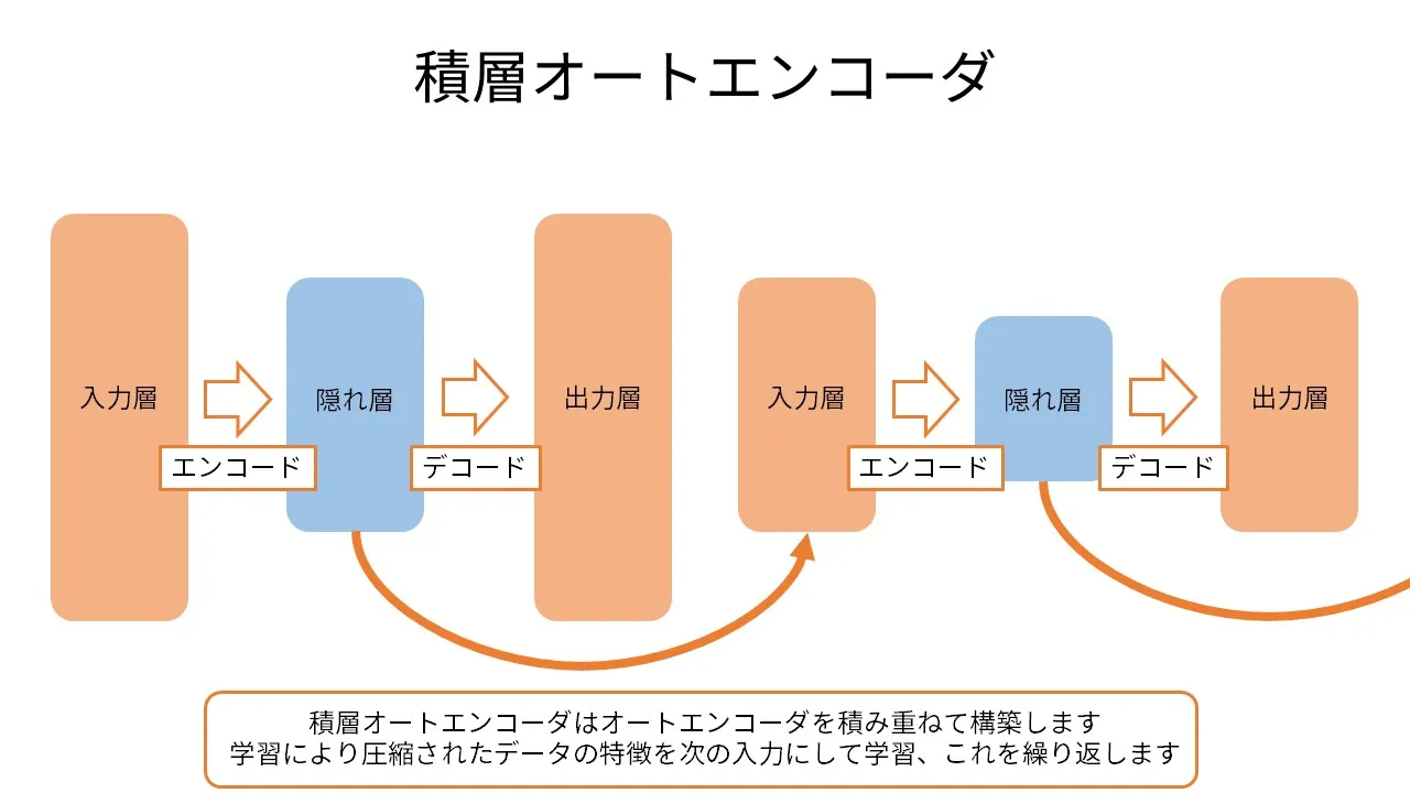 積層オートエンコーダとは、オートエンコーダを積み重ねることでニューラルネットワークの各層で抽象的な特徴表現を学習する手法です。