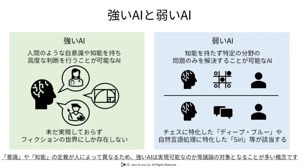 強いAIは未だ実現しておらず、フィクションの世界にしか存在していません。弱いAIとしてはチェスに特化したディープ・ブルーのようなAIや自然言語処理に特化したSiri等が該当します。「意識」や「知能」の定義が人によって異なるため、そもそも強いAIは実現可能なのか等議論の対象となることが多い概念です。