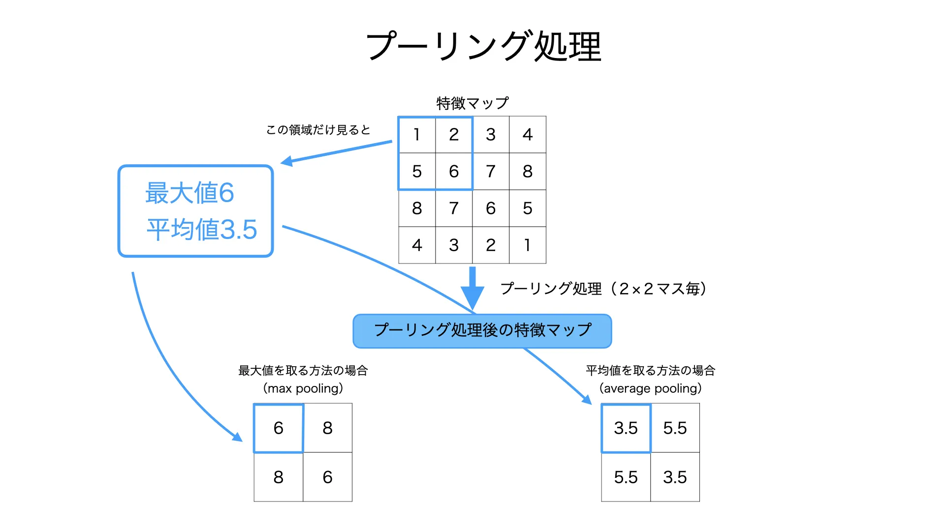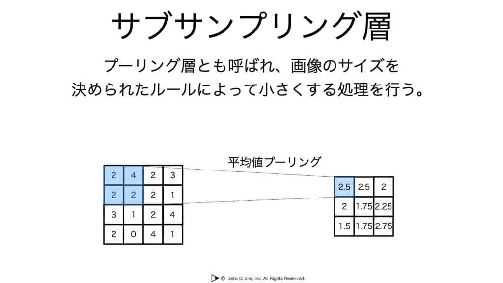 その処理は一般的にはある小領域ごとの最大値を出力する最大値プーリングや、平均値を出力する平均値プーリングなどがあります。画像では平均値プーリングを行なった例を示しています。