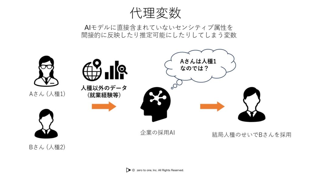 代理変数とは、AIモデルに直接含まれていないセンシティブ属性を間接的に反映したり推定可能にしたりしてしまう変数のことであり、不公正やバイアスの原因になり得ます。