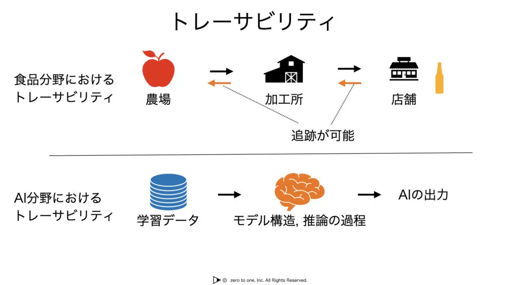 AI分野においても、トレーサビリティは重要な概念です。AIモデルがどのような学習データを使い、どのような処理を経て出力に至ったのかを把握できるようにすることで、モデルの説明性や信頼性を向上させることができます。具体的には、モデル構造、使用データ、推論結果の根拠などが記録・管理され、後から検証や説明が可能となります。これは特に医療、金融、行政などの分野で、責任あるAIの利用を実現する上で欠かせない要素とされています。