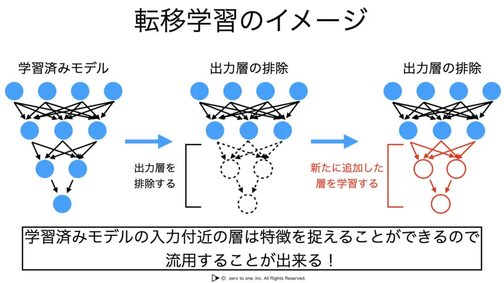 そのため新たに学習するパラメータ数は少なく,短い時間で学習できます。また,学習済みモデルが既にある程度の特徴を捉えているため,新たに用意する学習用データが少なくてもある程度高い精度が得られます。