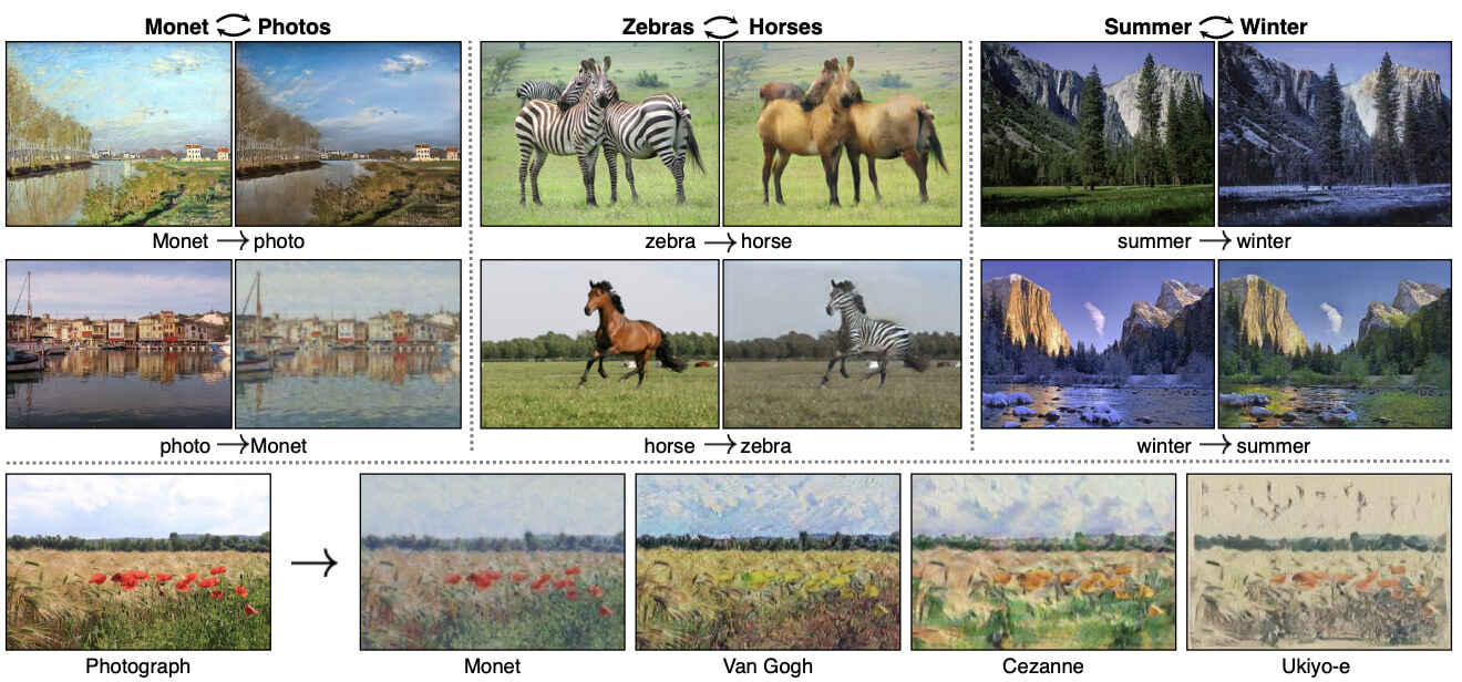 例えば、ウマからシマウマへの画像変換においては、ウマとシマウマの2つの画像群(訓練データはウマとシマウマの画像は一対一である必要はありません)を用いて、ウマ画像からシマウマ画像へ自動変換するネットワークを学習します。本物画像の分布と見分けがつかない分布を生成する生成器を学習させます。また、一方向のみではなく、シマウマ画像からウマ画像へ逆変換するネットワークも同様に学習します。そして、元の画像から生成した画像を逆変換した画像が元の画像と極端にずれていないかを検討します。