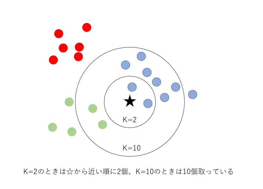 例えば仮にk=5に設定した場合、図4のように5個取ります。この場合は取った5個のうち青は 4個、緑は1個で最も多いのは青だったため、☆は青に分類されることがわかります。