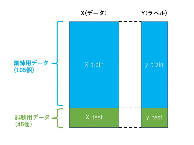 また、データは訓練用データと試験用データに分割する必要があるのでした。sickit-learnにはデータを訓練用と試験用に分割してくれるtrain_test_splitがあります。