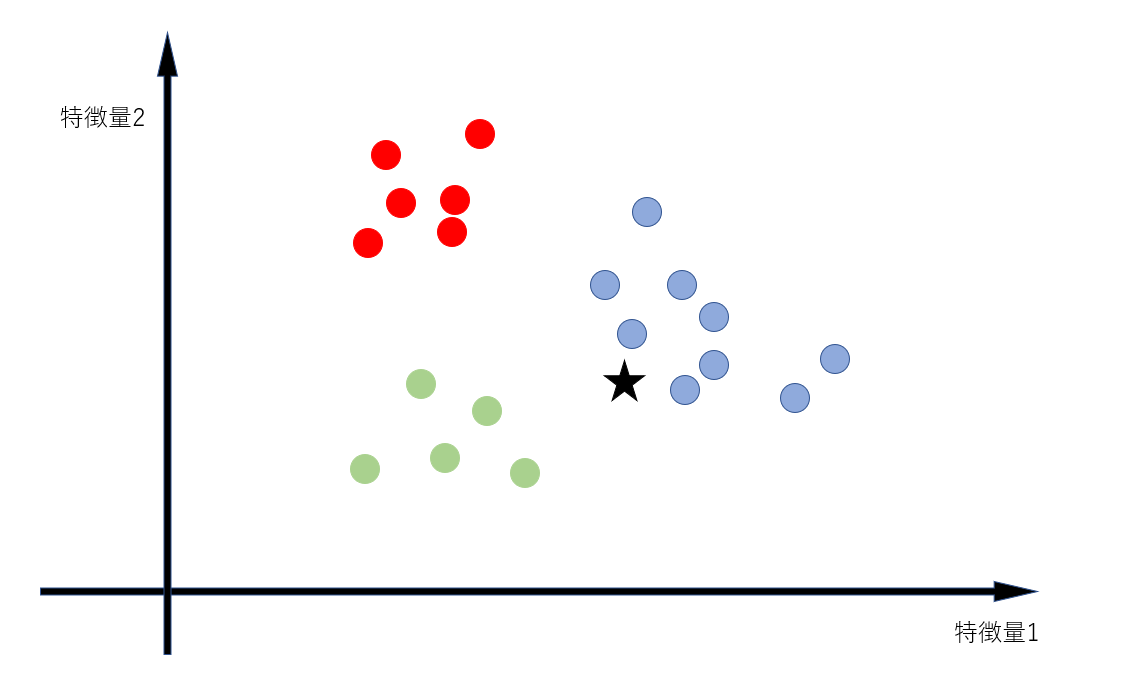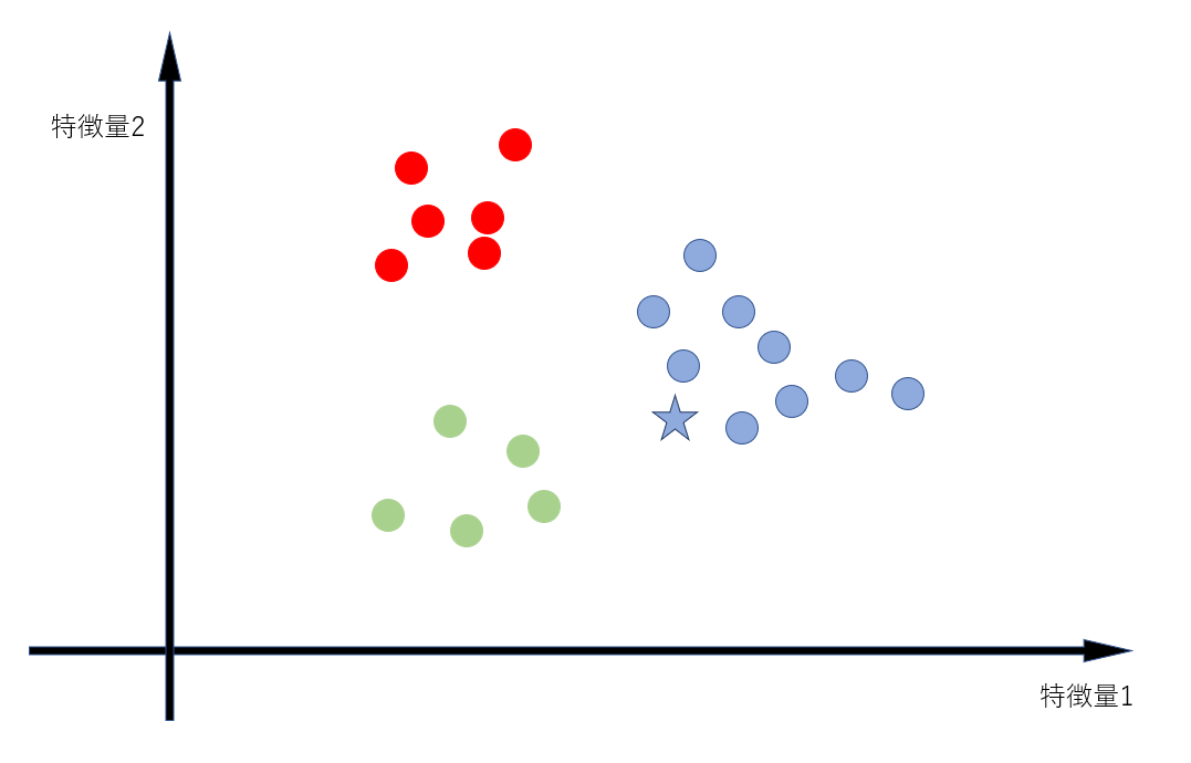 このデータを我々人間がグループ分けする場合、我々は塊になっているところのデータをだいたい同じグループと分類するでしょう。つまり上図の☆は青に属するのではないかと考えるわけです。
