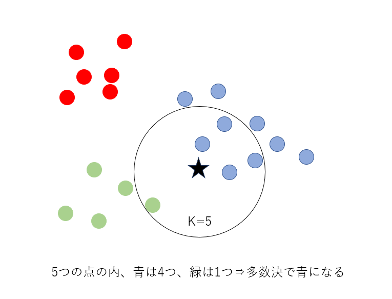 例えば仮にk=5に設定した場合、図4のように5個取ります。この場合は取った5個のうち青は 4個、緑は1個で最も多いのは青だったため、☆は青に分類されることがわかります。