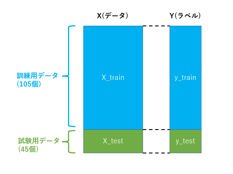 また、データは訓練用データと試験用データに分割する必要があるのでした。sickit-learnにはデータを訓練用と試験用に分割してくれるtrain_test_splitがあります。