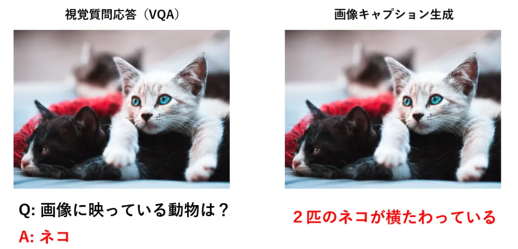 V&L分野の研究として有名なのは、与えられた画像に関する質問に答える画像質問応答(Visual Question Answering; VQA)や、与えられた画像の説明文を生成する画像キャプション生成(image captioning)などがあります。