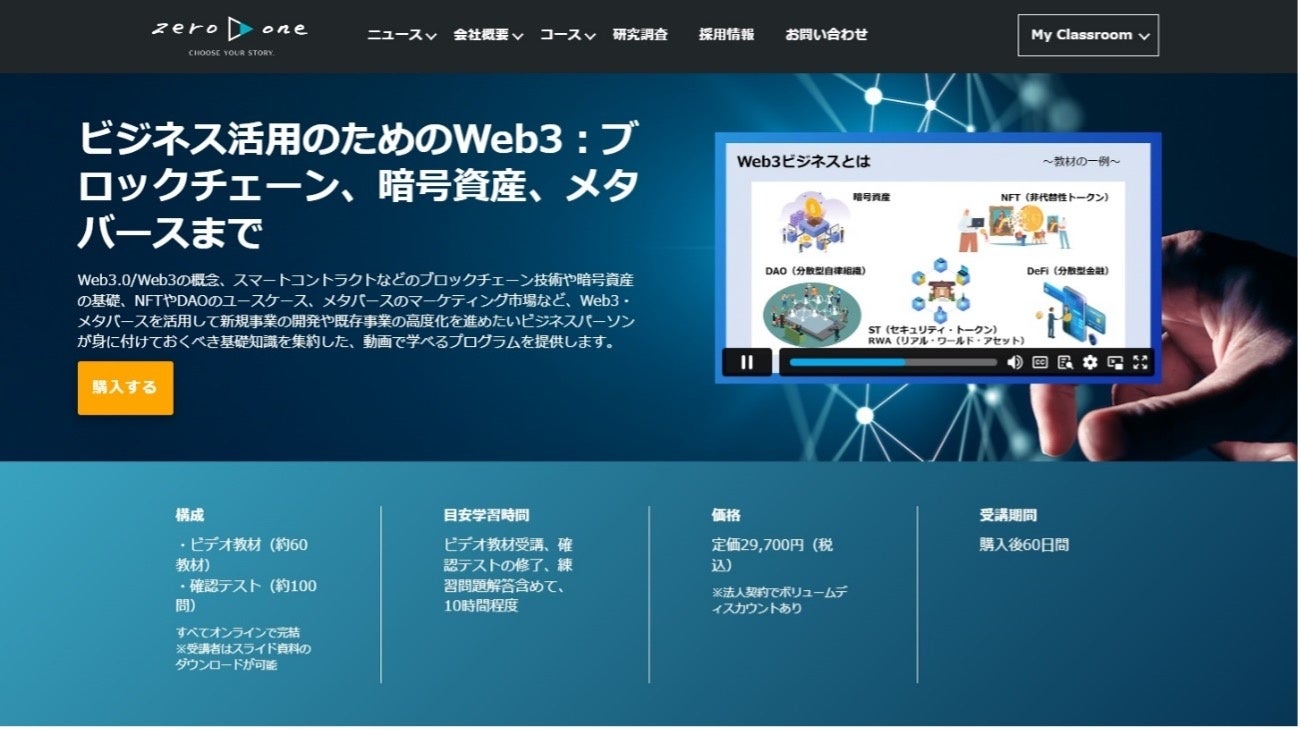 そうした中、金融分野でのWeb3活用に実績がある野村證券が有識者の学術的な協力を得ながら運営しているWeb3ビジネスメディア「Web3ポケットキャンパス」と、AIやデータサイエンスなど、先端テクノロジー分野のオンライン教材開発に強みがあるzero to oneが連携し、Web3事業開発を進める上で必須となる知識を体系的に学べる本コースを開発しました。